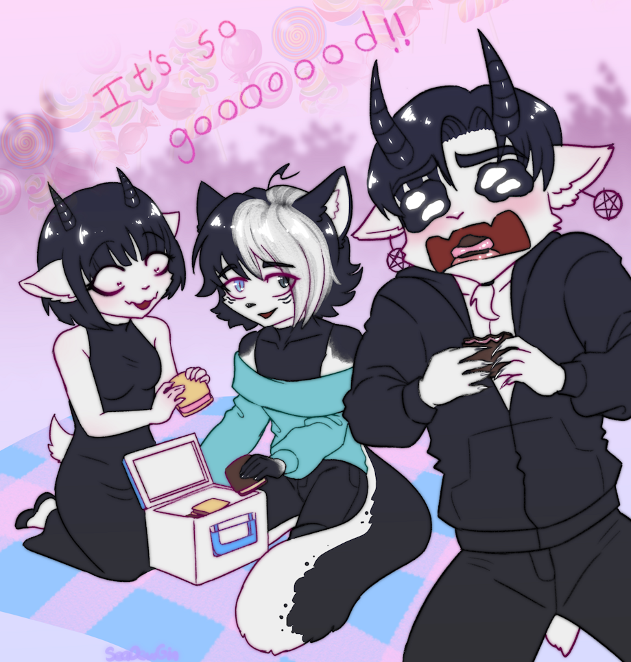 -Take this, goats (Flesh looks at small black and white cat Abel) -Why is this being giving us this shit? -He is probably our next food, so shut up and be sexy (they take the icecream sandwiches) -Ohh my lord... OH my god, OH my father... -¡¡ꓷOOOOOOOOꓨ OS S'ꓕI