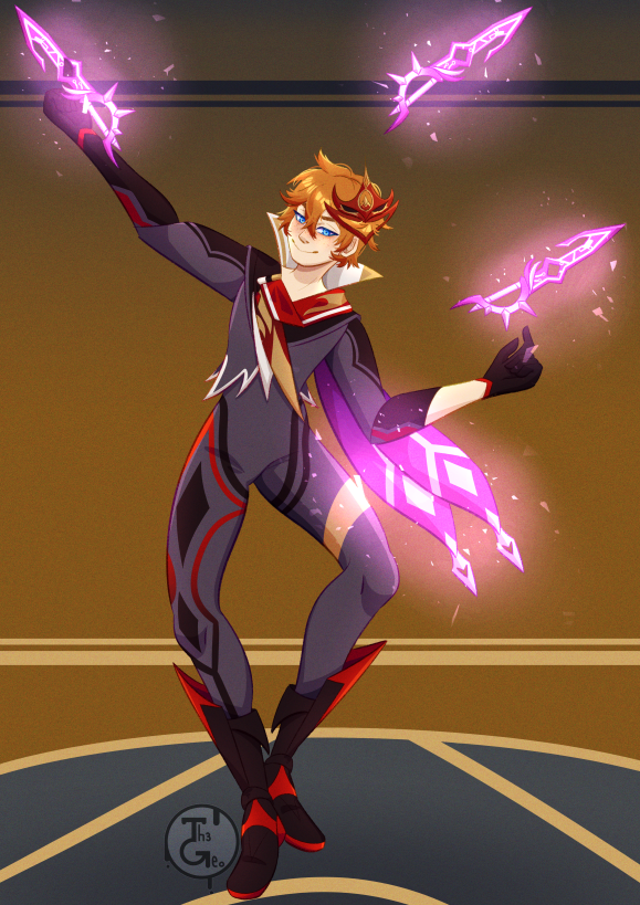 A drawing I did for an ArtCollab in Facebook about characters of Genshin in a Circus theme~ I got Tartaglia! <3