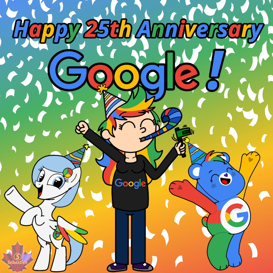 For celebrating the 25th anniversary of Google, i decided to draw three Google's themed characters: an humanized version, a Care Bear version and a pony version called Google Chrome that i saw on Derpibooru. The human one blow a party blower with an Purim Gragger for making loud noise. ______