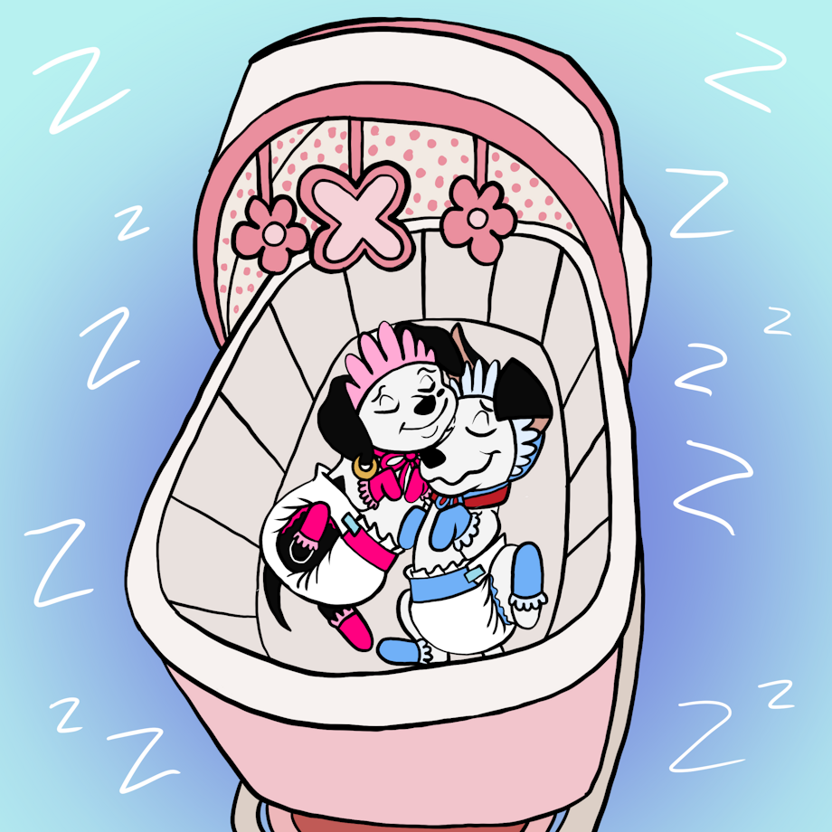After a day of playtime together, Lucky and Two-Tone decided to take a nap in a bassinet