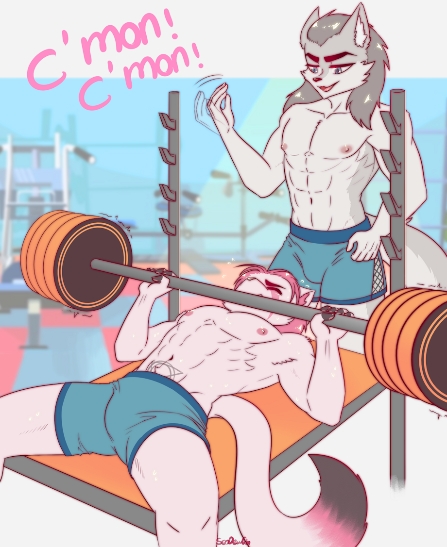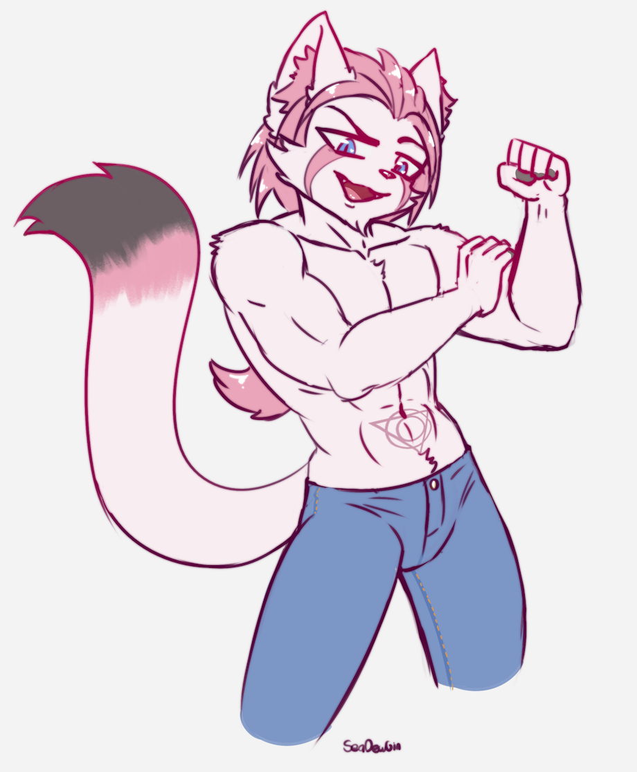 STRONG, sexy lord, light pink fur and pink long hair in a pony tail, blue eyes, has a tatoo on his belly.