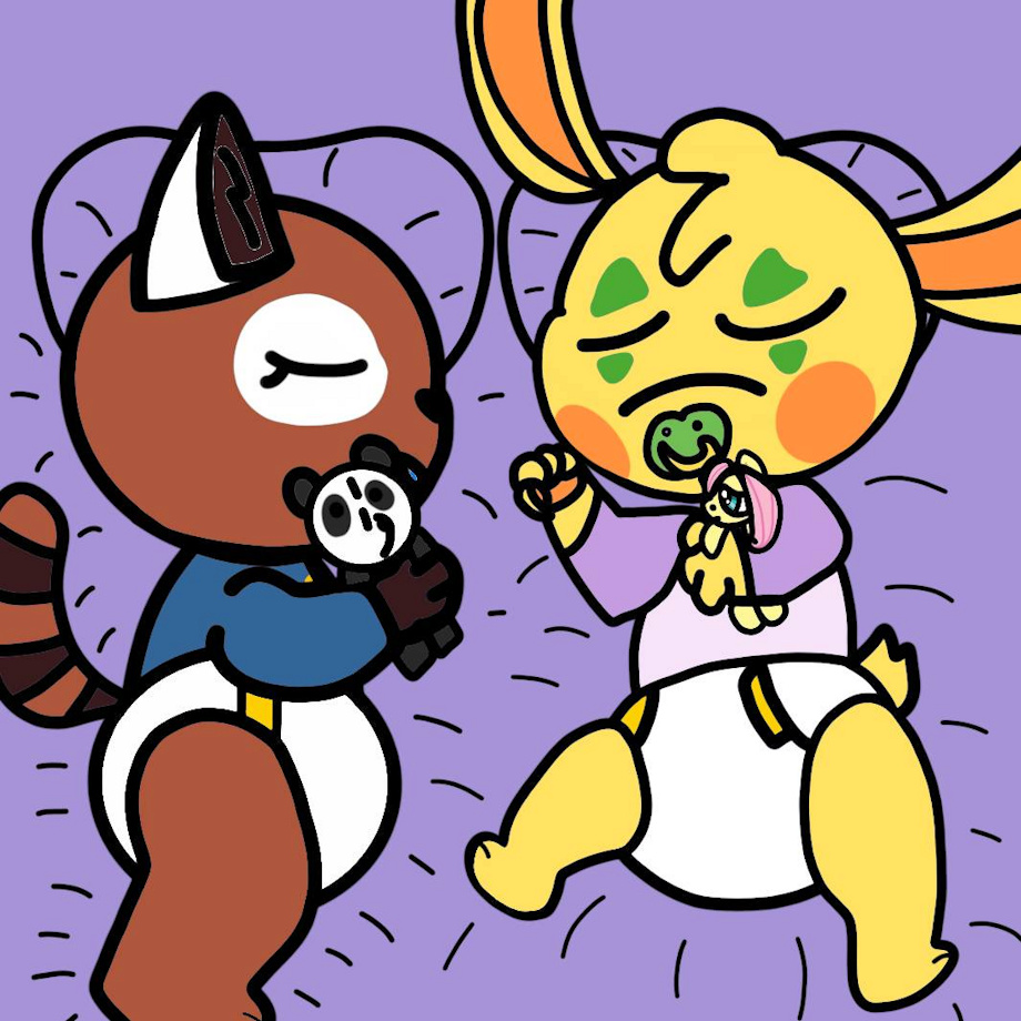 Ling Ling had a sleepover at Bunzo's last night, here are these two sleeping with Ling Ling snuggling a panda plushie that Bunzo gave her.
