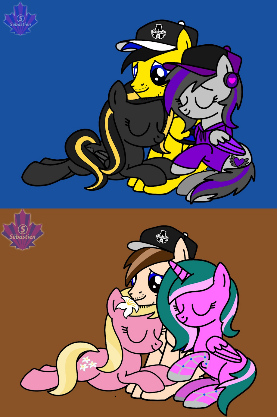 Here's a double drawings by using the same base: for PonySeb 2.0's side, his real girlfriend is Viola Love, while his girlfriend of the g4 is Midnight Strike. For Seb the Pony's side, his real girlfriend is Sapphire Moon, while his girlfriend of the g4 is Lily Valley. ______