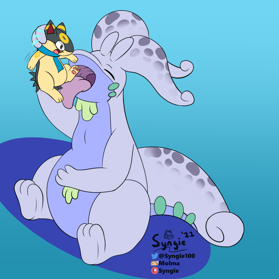 too close to Bleu while the big goo dragon was eating, and now he's about to become part of Bleu's meal too.
