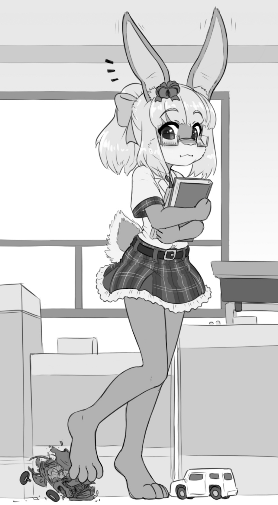 How adorable! May looks great in that school uniform, and her clutching her books as she accidentally stomps that car absentmindedly is a great situation! Cute ponytail bow and ribbon! The classroom with the buildings and whatnot in it is very silly. Architecture class seems fun at this school!