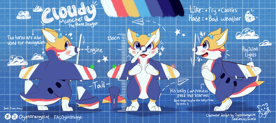 Cloudy is a cute person. Very playful with his friends, sometimes silly but still cute. Don't forget to give him belly rubs, he loves that. Or ask him to take you to fly into the sky, he likes to take his friends to see the beauty of this vast world. And try giving him food or cookies, he likes cookies he will be very happy