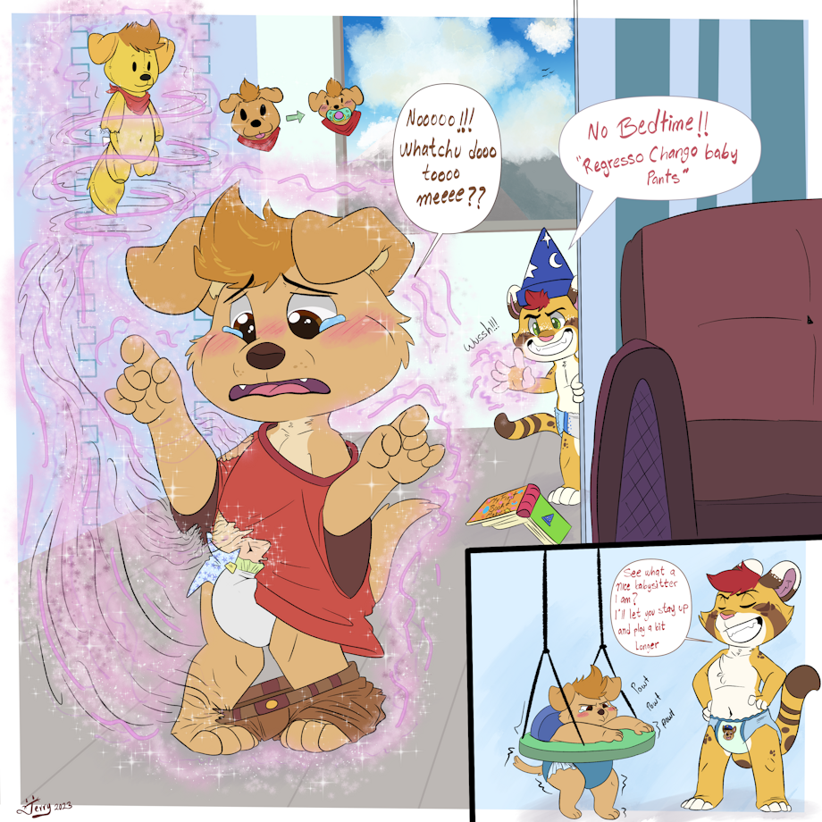 "Jake is babysitting Terry tonight, but Terry likes to play pranks on his babysitters and has cast a spell on Jake to show that he is a big kitten and can stay and play later."
