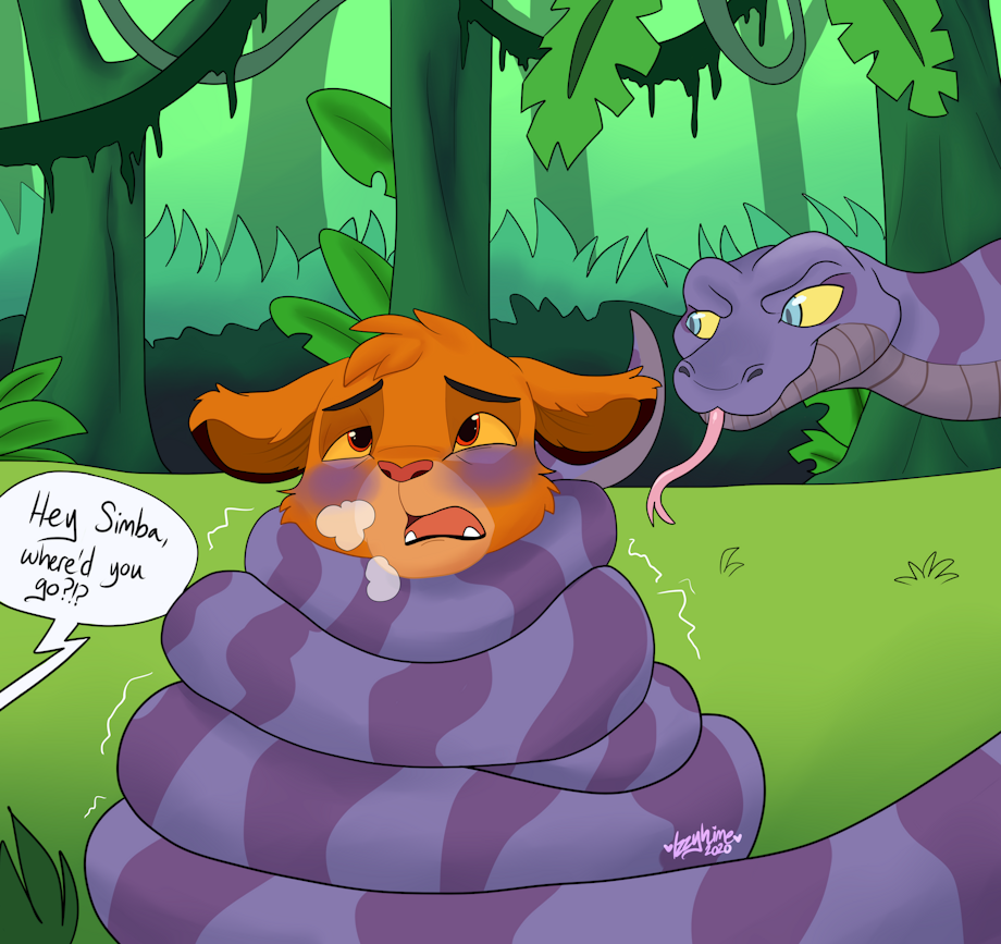 "Lemme go!" Simba cried out in annoyance, not fully registering the danger even when more coils looped around his shoulders. "What's the big id-" His question of indignation was cut off when the purple scaled tail coiled around his neck and slowly gave a squeeze. Gradually, the former prince of the Pride Lands found himself barely able to breath with coils squeezing his throat with his torso. His eyes had both widened by reflex and in horror with a slow wheeze.