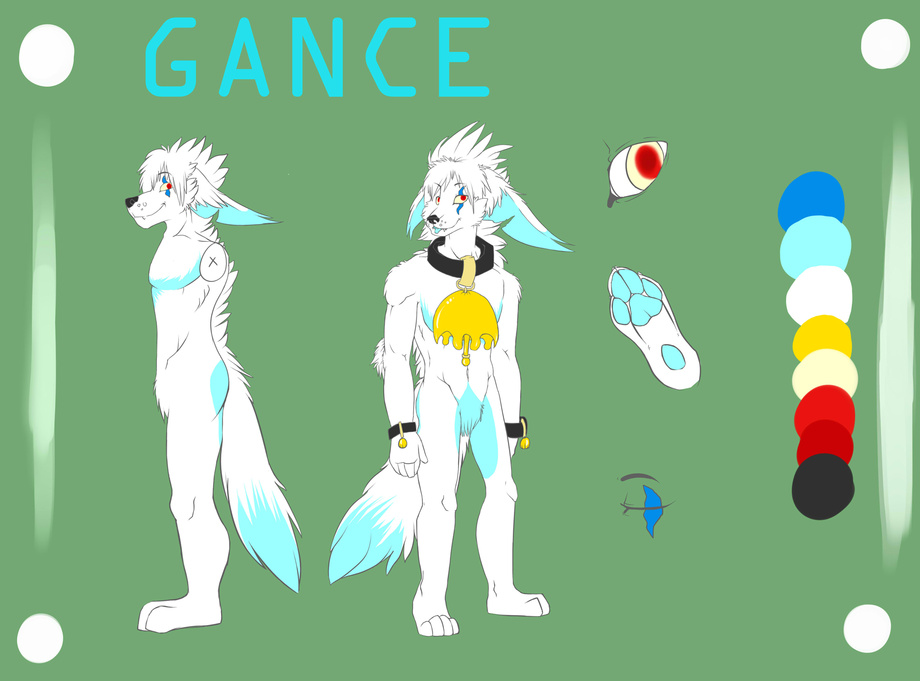 Gance is just below average height for a human male, 5'7", he's more lean build than anything, weighing in at 131 lbs. He is coated mostly in white, with hints of teal on certain tips of his body, most notably his chest, ears, rump, crotch, paw pads and the tip of his tail. He is also keen to wearing an oversized bell on his black collar, as well as two smaller ones he has wrapped around his wrists. The Bells were given to him by an old friend, and he wears them proudly.