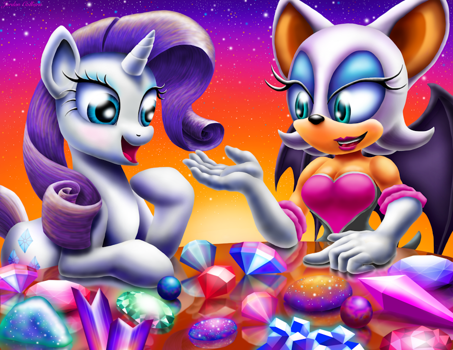 This is a drawing of Rarity from show My Little Pony: Friendship is Magic and Rouge the Bat from the Sonic the Hedgehog games showing off their jewelry collections to each other. Many fans like to pair Rarity and Rouge together since they're both the stereotypical hyperfeminine characters of their respective series and they both share a love of jewelry so I figured I'd do the same thing here.