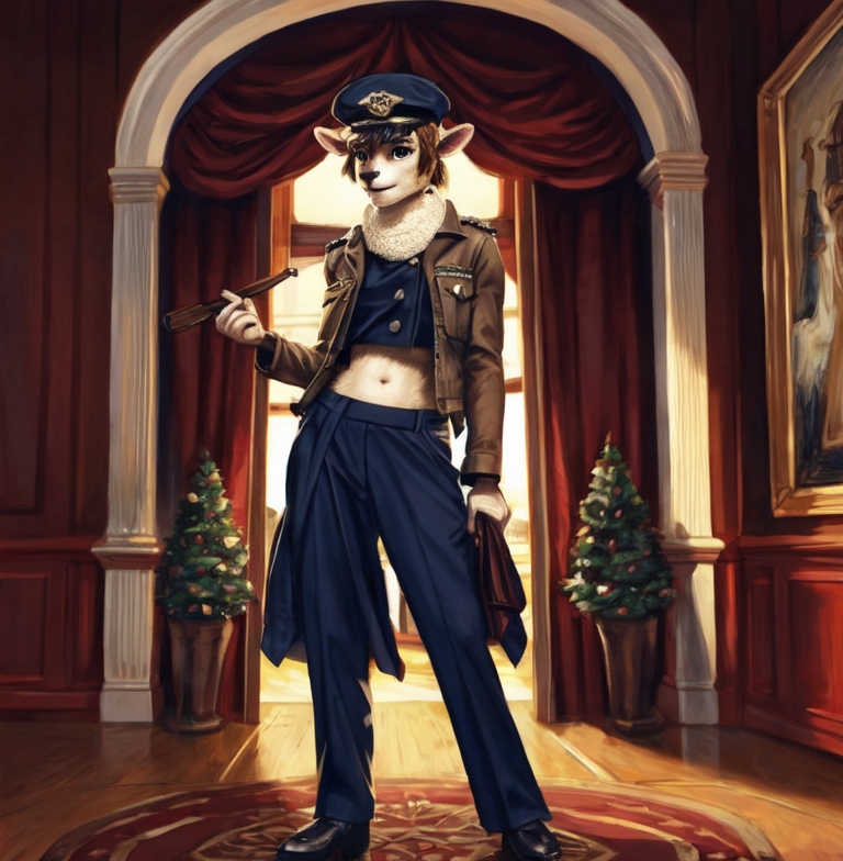 Prompt: masterpiece,high quality,best quality,detailed bacground,detailed background,detailed body,detailed eyes,Holding an object pose,Wearing Navy Blue Berets,Sporting Gibson Rolls Haircut,Wearing a Wool Beret,Wearing Capri Pants,Wearing a Cropped Jacket,Inside 1950s Grand Hotels: Bellhops, golden lobbies, revolving doors, beige suites,Fluorescent Lighting,(((Circleart sora))),<lora:CircleArt_Sora:1>,solo focus,virtuids, <lora:Furtastic_Detailer:1>, by Eve Arnold