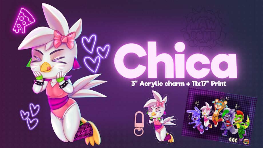 Fourth in our Acrylic Charms is Chica! Her charm will come with a Pink Clasp, and you have the option to get her with the print!