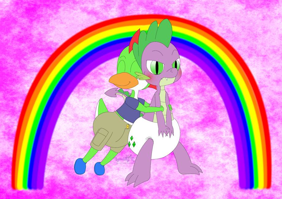 Yosh, a Duck-Dragon Hybrid with the color scheme of a Green Yoshi, with several red spike-like fins running down the back of his head, hugs Spike from behind around the abdomen area, reaching only over Spike’s arms. He is wearing a dull dark blue t-shirt and tan cargo shorts, with a thickness that clearly shows he has a diaper under them. He also has simple blue shoes over his feet. He has a big smile on his beak and his eyes are closed with a cheerful expression.