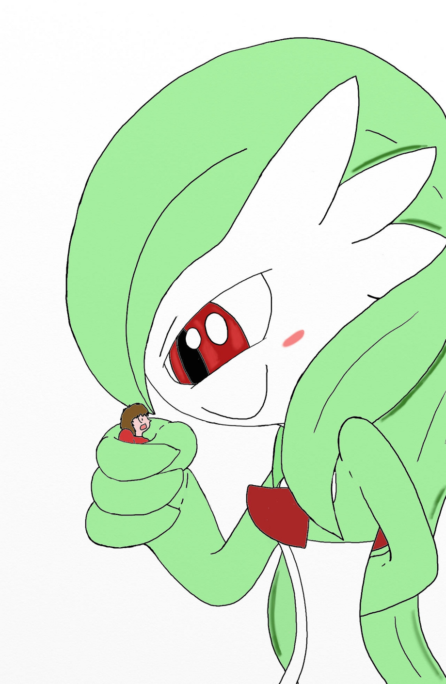 My very first drawing of Gardevoir back during DA some years ago. It shows a girly male Gardevoir femboy in love with his own human master.