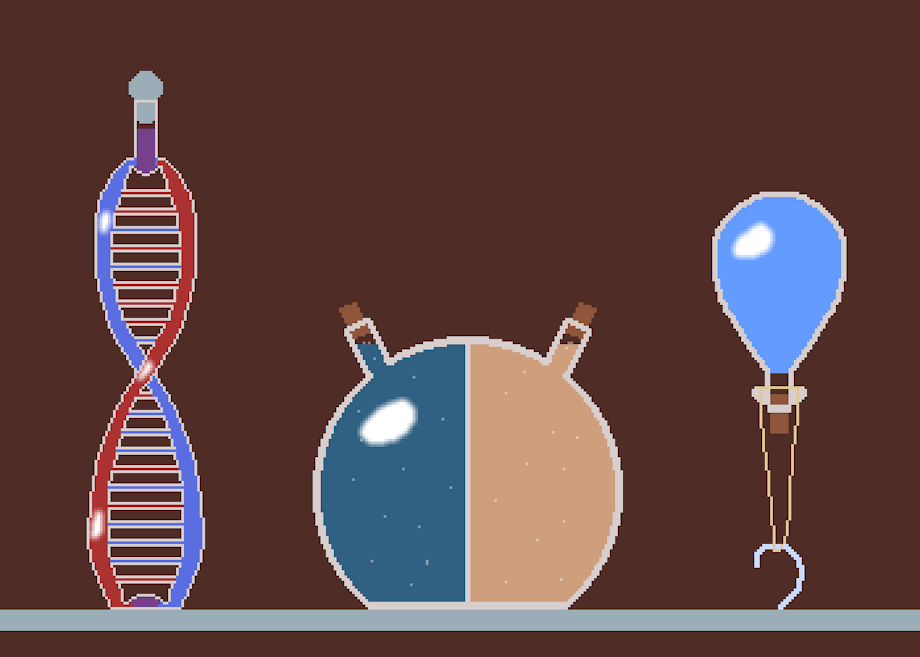 The first is a transformation potion. The shape of the bottle itself actually matters for it, it HAS to look like a stylized DNA strand. Those connectors sometimes switch between red and blue on their own, but are never purple. When the potion is first created, it's grey, bitter, and ineffective. Once something that was part of an animal is put into it, it changes to this red and blue color, the bitter taste goes away, and the potion can then turn the user into whatever animal the sample came from. This one's already been set up, but not labeled, so who knows what it might change someone into?