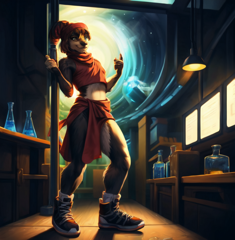 Prompt: masterpiece,high quality,best quality,detailed bacground,detailed background,detailed body,detailed eyes,Peeking from behind a corner pose,Wearing Two-Tone Saddle Shoes,Flaunting Victory Rolls with Bangs Haircut,Wearing a Headscarf with a Knot,Wearing a Turban or Headscarf,Wearing a Gingham Crop Top,Inside a 1950s Science Lab: Scientists in white, colored liquids in beakers,Incandescent Lighting,(((Circleart sora))),<lora:CircleArt_Sora:1>,solo focus,sukni, <lora:Furtastic_Detailer:1>, by Gordon Parks