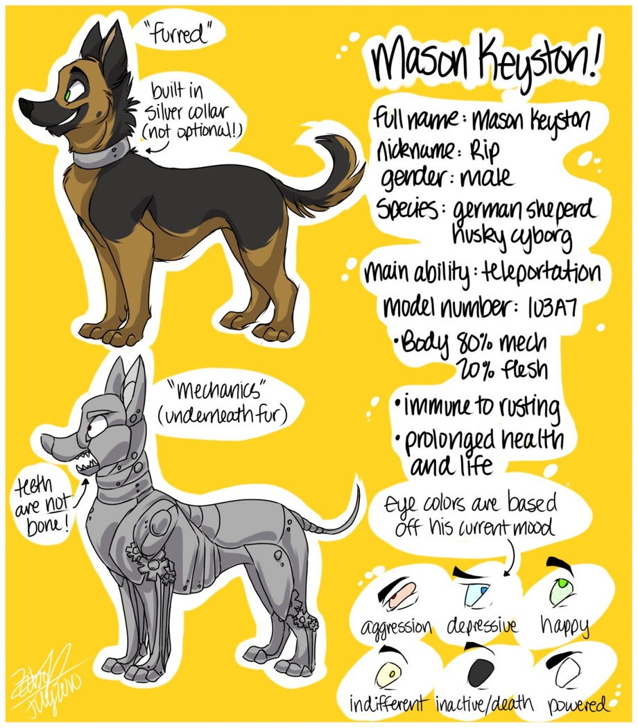 Rip has a german shepherd's body and head with the markings of a husky's pattern, except on face. His overall size is comparable to a large adult human standing chest high from head down.