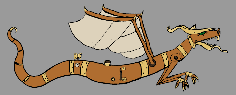 Second: Zekaian Clockwerk Dragon for U8. It's an oversized toy dragon, but also expels fluid from its mouth at great velocities- an effective flamethrower or acid gun. Made in GIMP on an XP-Pen Artist 16.