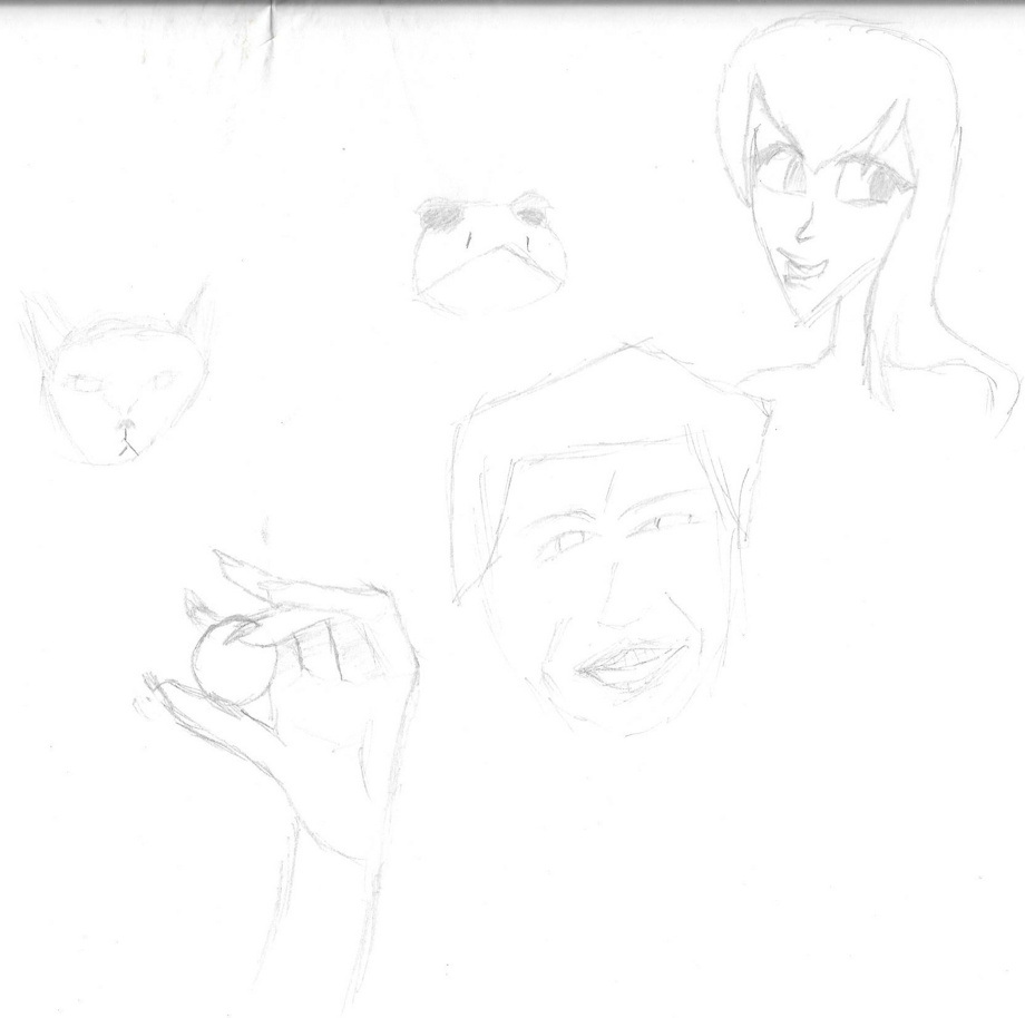 Fifteenth: A hand holding a ball, a Sphynx cat face, a frog face, a caricature of an old, now-forgotten friend, and a drawing from memory of a fictional character also forgotten. Certainly one of the oldest here, no doubt 2018 or 2019.
