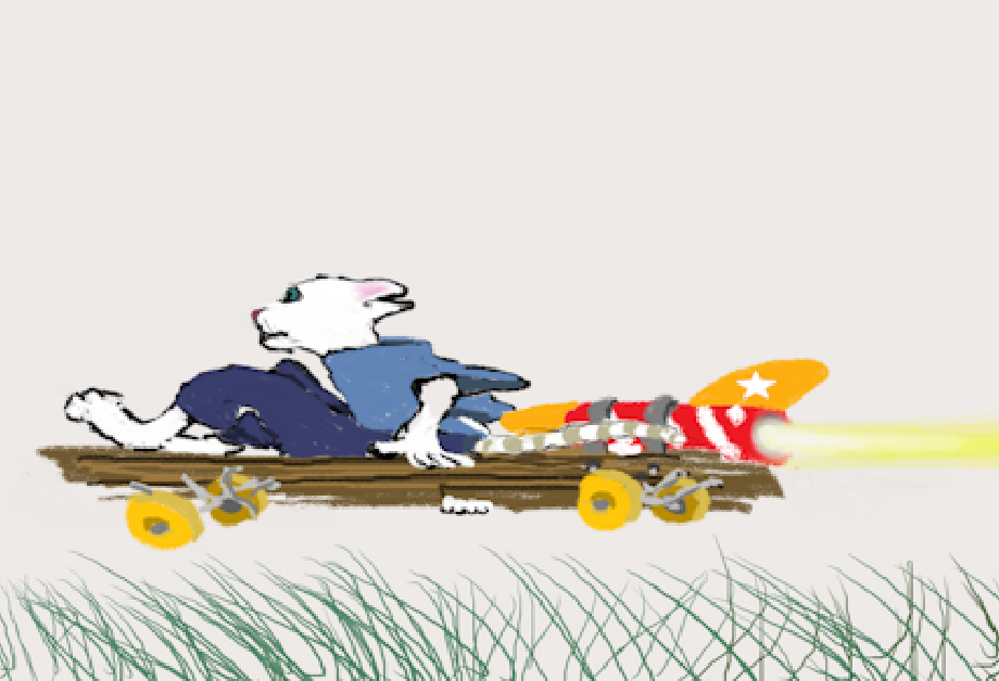 While this teenage cat and his fellow teenage friends were tokin' some weed in Daddy's garage, they got the wild idea of putting together a rocket powered kart contraption, consisting of a home made plank deck, large all terrain skateboard wheels, and a re-fuelable class A rocket. Once the rocket kart project was complete, they drew straws to determine who will volunteer to be the first one to test it out, and the white cat got the shortest straw. During the test run, the cat found out the rocket kart has more power than any of them had bargained for as he holds on for dear life. By the way, he's not going to have a happy landing with that front axle getting ready to fall off while in flight...Just hope his mommy and daddy has a good family health insurance policy that covers accident and hospitalization.