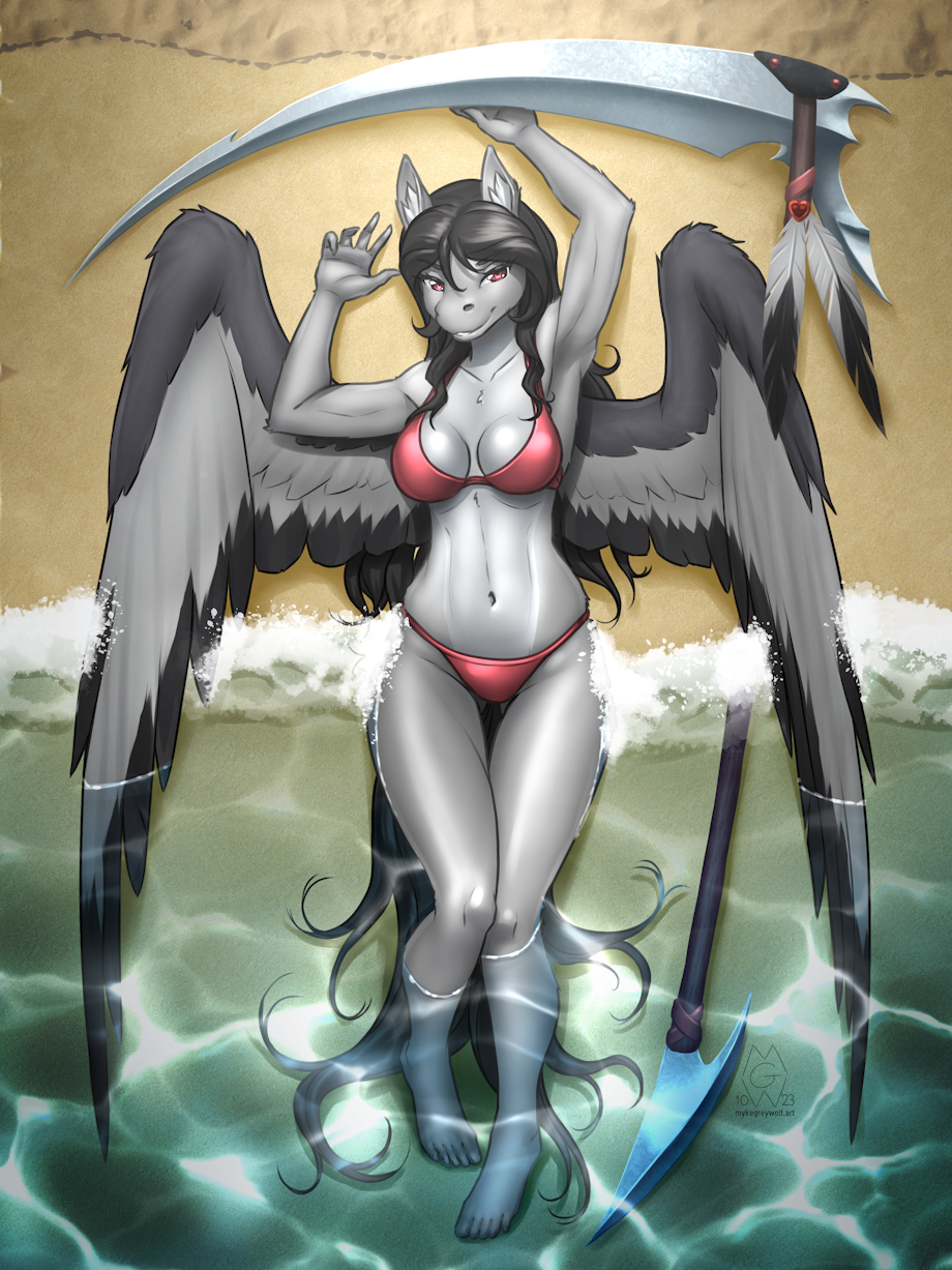 "Just relaxing by the sea with my HUGE FRIGGIN' SCYTHE! XOXO"