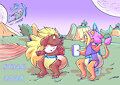 Illustration of Tylahn the wet and messy diapered raccoon holding Everett the wet and messy diapered badger's diaper and smiling at him, while Everett smiles at the viewer. Everett's snake plushieis looking at the viewer next to his bed.