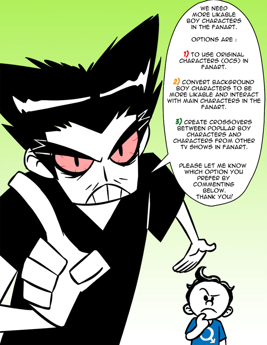 we have a shortage of boy characters that people can like, there is too many weak boys, dumb boys, and annoying boys. we need to fix that somehow. we can't rely on mainstream media stories due to their severe hatred to male characters, so we need to improvise as artists and fans of media that is still lacking in boys quality. our options are 1- use OCs and inject them into the fanart of mainstream media. 2- use background boy characters from the shows and convert their personalities to be more likable boys and start making them interact with the main characters in the fanart. 3- do crossovers where popular boy characters can interact with characters from other TV shows in the fanart. so far, those are the only solutions I can think of, but I'm not sure which ones you prefer. please leave a comment or message me of which one of these you prefer. this will not be the last post I make about this, but I'll try to keep them as enjoyable as possible.