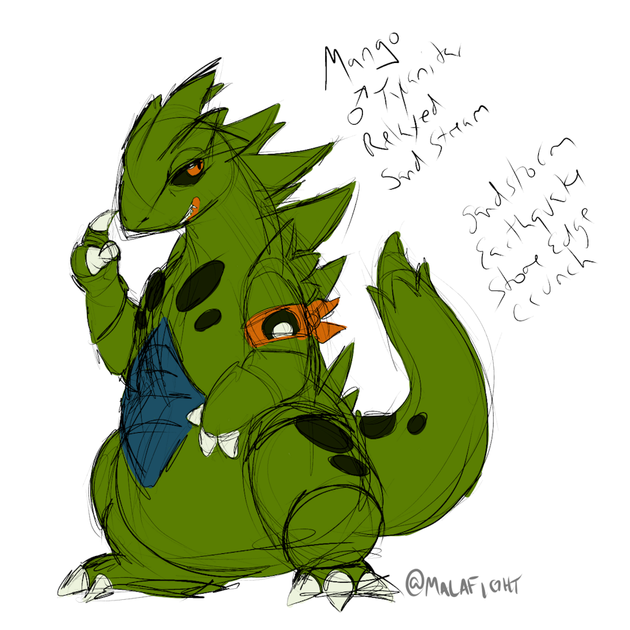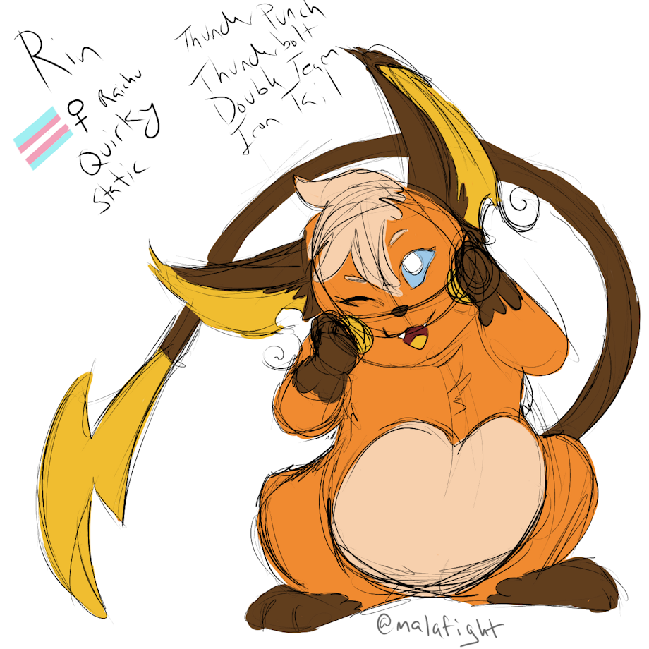 His pokemon: Cleo, Espeon: a bit flirty, enjoys teasing Buck in particular and has a biting wit when she wants to Buck, Mightyena: he’s big dumb and aggro but has no fear and is actually a big softie at heart Mango, Tyranitar: the laziest motherfucker you’ve ever seen. gives no fucks. Rin, Raichu: she’s adorable and peppy and friendly, but given to excitement-shocking new people without realizing it