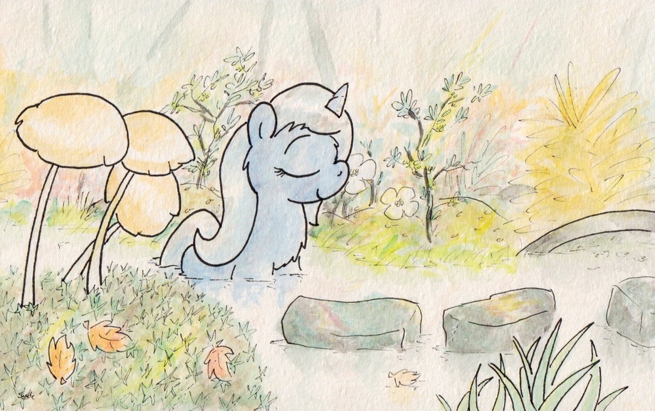 can't see why you wouldn't be satisfied with this it is so beautiful. the way you have the grassy area in front more detailed then the grass in back across the water, the way the rocks lightly reflect in the water as does trixies legs. even tho small details they really add to the grand scale of the piece.