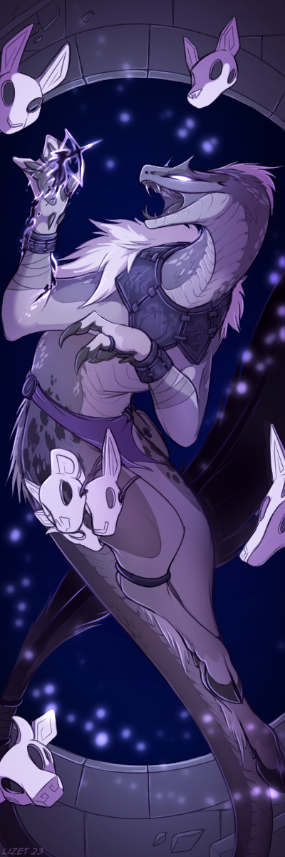 The third of the bookmark designs! Continuing the theme with the gods involved in the active plotlines, The Mask Maker! Plus I just really wanted a questing beast in this merch pile somewhere.