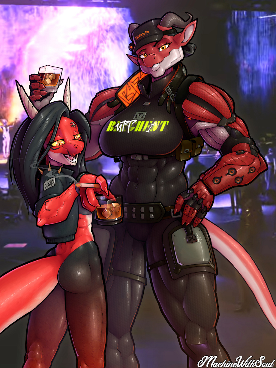 - What are those two chili peppers standing there at the bar? - What kind of peppers?.. Ah, this is Adena, a well-known mercenary in our city. - And this whopper? - Hmm, I don't know her. By the implants, I guess she's a Bargest recruit?