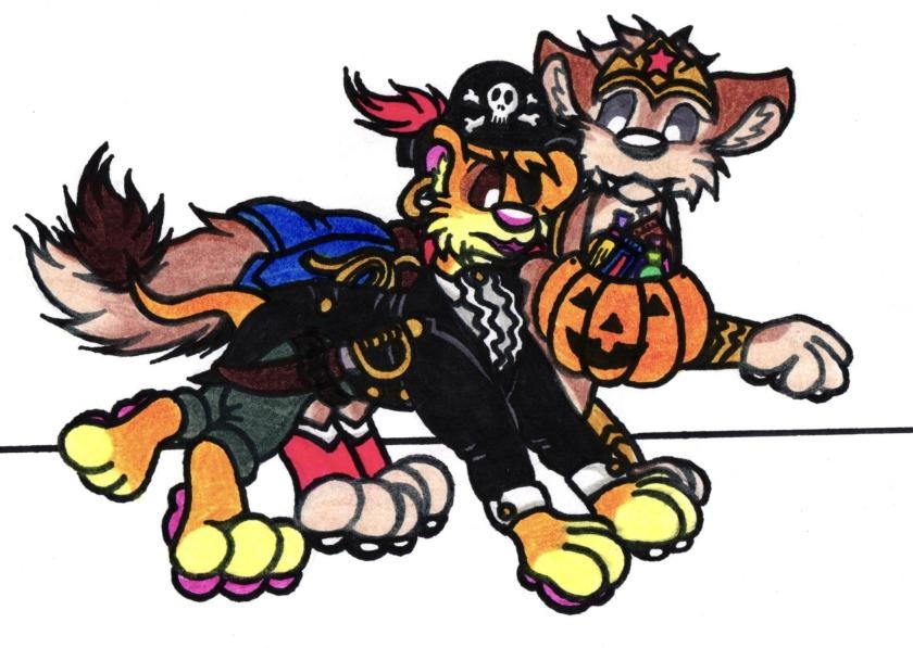 Lucy, dressed as Wonder Woman, is taking SImba, dressed as a pirate captain, trick or treating.