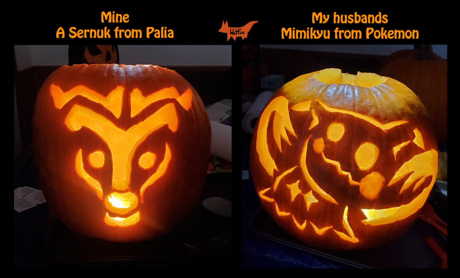 Its a tradition in my family to carve pumpkins every year. Usually I use a stencil from a book or online. But this year I free handed for the first time while looking at a reference. Its lopsided and uneven but pretty decent for my first attempt. My husband on the other hand always free hands and hes so good at it. Always takes him awhile but its worth it.