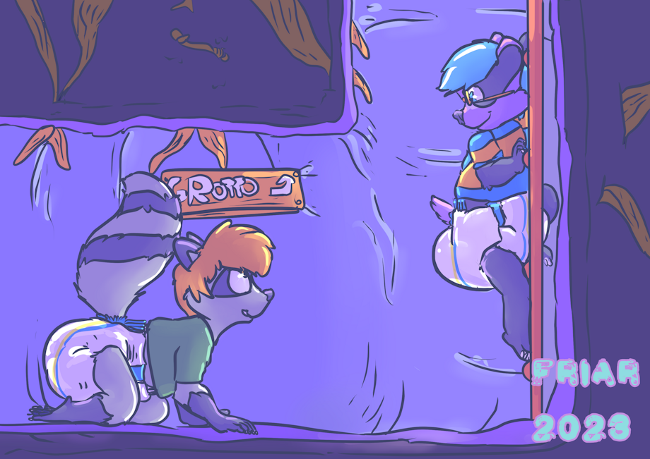 Illustration of Everett the wet and messy diapered badger and Tylahn the wet and messy diapered raccoon crawling in the tunnel leading to the Nowhere Grotto. Everett is climbing up the ladder and Tylahn is crawling behind him, both looking at each other.