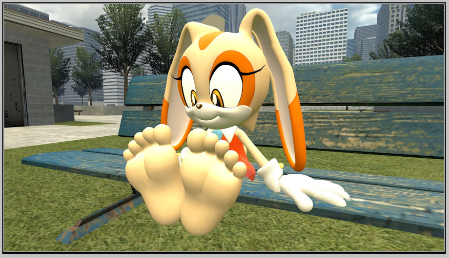 On the park chair, Cream Rabbit tries to do counting her toes by touching it, starting from sitting to standing. Her boots are standing beside her after removing it