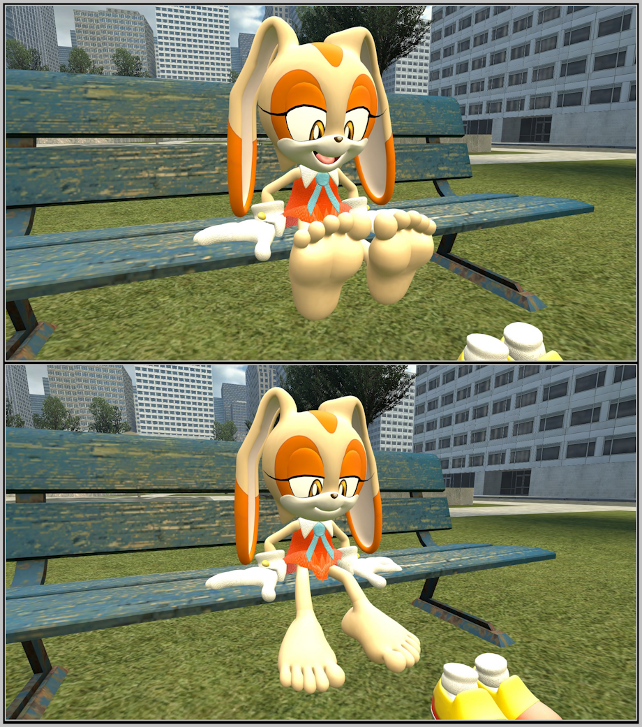 On the park chair, Cream Rabbit tries to do counting her toes by touching it, starting from sitting to standing. Her boots are standing beside her after removing it