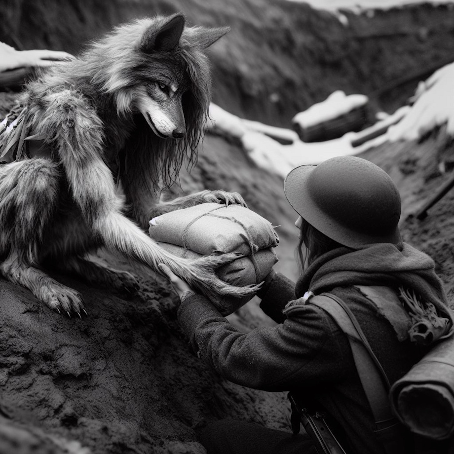 images 2, 3 & 4: realistic black and white photograph, lithe anthro werewolf with a serious expression sitting in a muddy frozen world war 1 trench offering a large ration package to a world war 1 british soldier