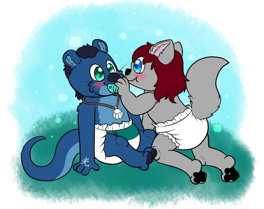The wolf giggled cutely crawling on up to the otter and stuck a green pacifier into the otters mouth, making him blush and suckle cutely.