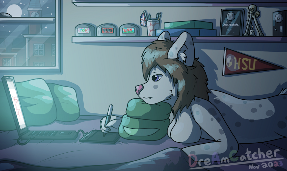 Sheilah's up way too late working on some art. She's determined to finish this piece, despite running on fumes