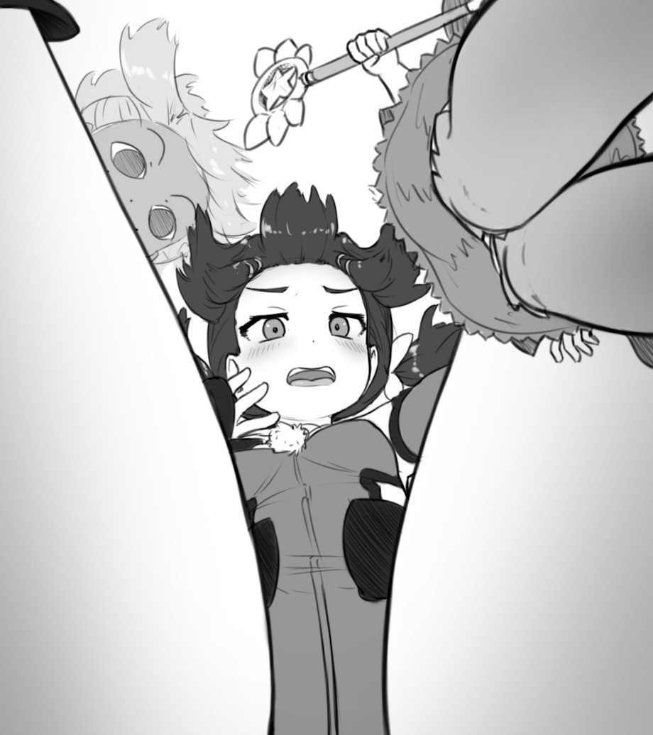 The angle is so steep that even Miyu's modest chest becomes notable from the sheer neck craning, and her surprise is further shown despite the limited frame of view with her raised hand and open fingers! I do think her expression is a tad goofy, mostly the shaping of the mouth (I think it's probably best to try to lean more into comical shaping for surprised expressions) but the blush is adorable too! Only natural when little Ilya's down there! It really is incredible how Ilya herself can be magnified significantly up close to the camera and have such a low viewing angle herself, yet still feel so utterly small in the bigger picture and have Miyu's canyon-esque thighs easily overtake her existence.