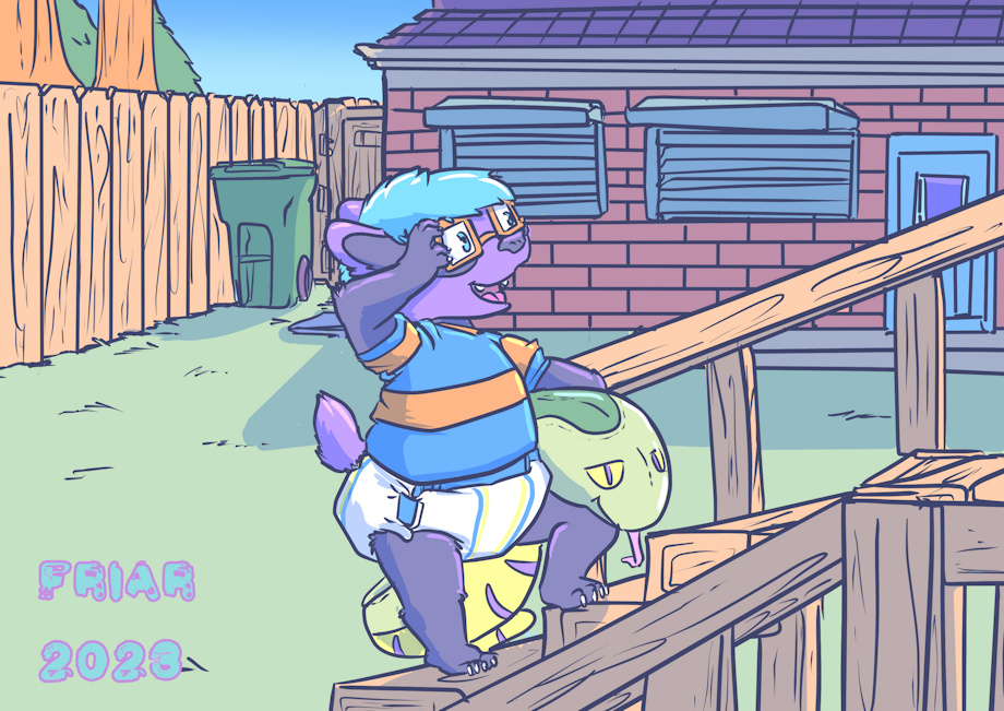 Illustration of Everett the wet and messy diapered badger holding his snake plushie, adjusting his glasses, and walking up the stairs to the backyard playground.