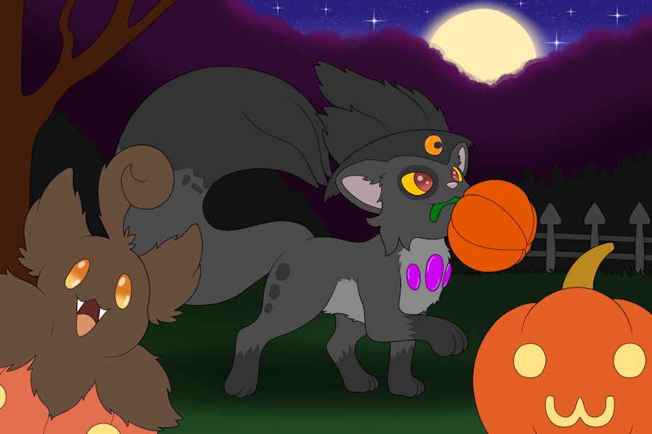 I'm a spooky Nickit / Mismagius hybrid, roaming around the night to steal your pumpkins.
