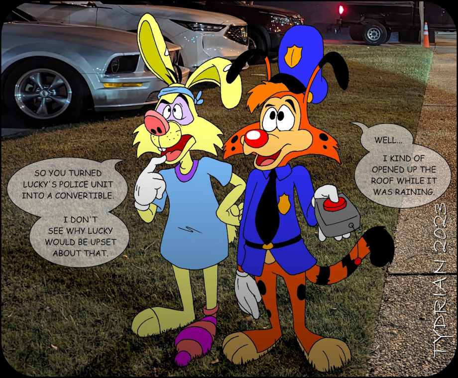 Bonkers thought it would be a nice de-stressor for Lucky to open the roof of the police car.