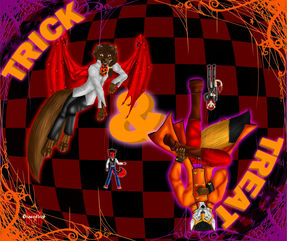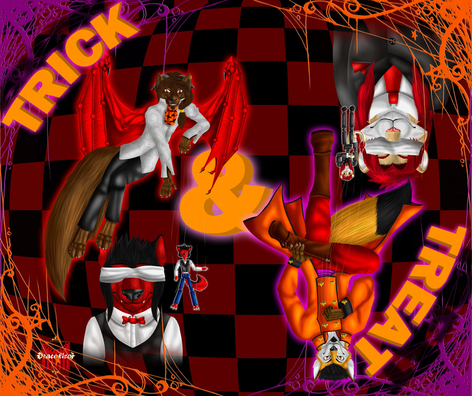 I hope you like it!! This is a concept art regarding Halloween season based on Vocaloid's song Trick AND Treat that tells the misadventure of a little girl lost in the forest that ended up as the plaything of a pair of demons in a dark wood manor (Nothing related to FurWars Dark Wood Manor, that one was based on Bad End Night also from vocaloid). In this case, Dave and Draco are the demons luring innocent furs to their lair, and the poor victims are Heiban and Novak! (Heiban is Dave and mine's son and Novak is Dave's brother).