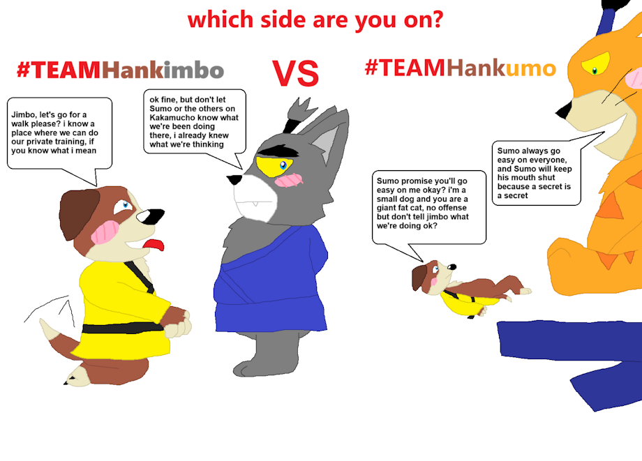 Anyway, since you guys liked my first PoF fanart i decided to start my ship dynamic of between Hank, Jimbo and Sumo thus starting a love triangle. What about you? What ship you like the most, Hankimbo or Hankumo?