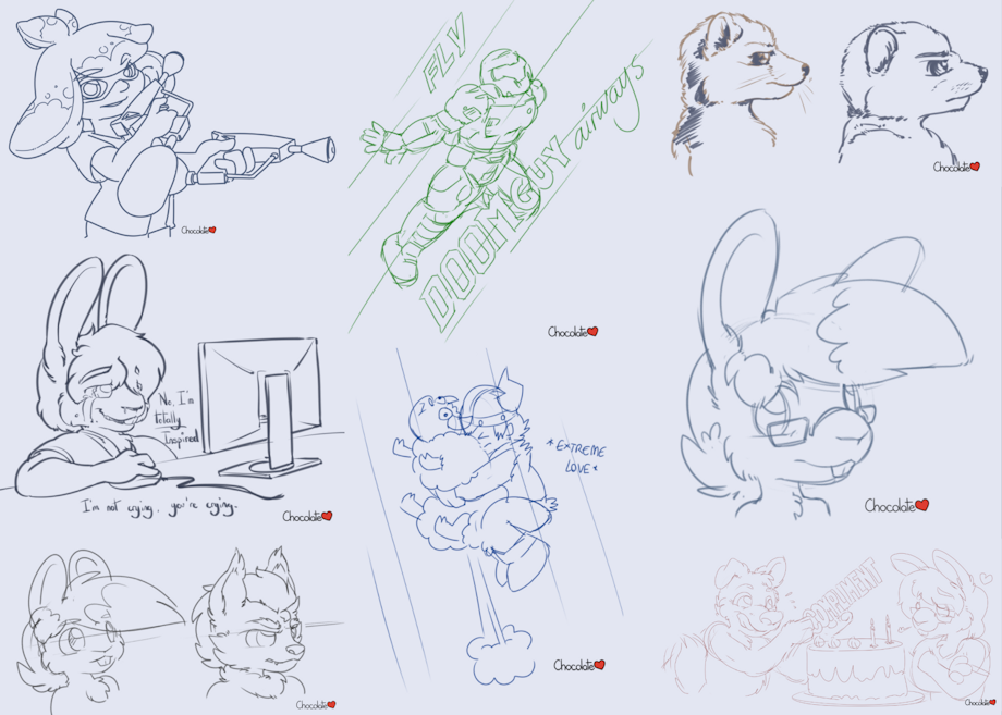 Just a bunch of really old personal sketches, featuring old designs of myself, Chocolate, Jack, and some fanart of assorted video games that also reference speedruns from back in the day.