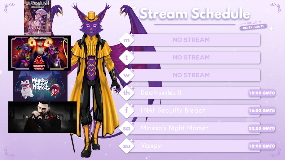 Here's my stream schedule for the week. Searching for clues in VHS tapes with Amanda the Adventurer, debeaking Chica in Security Breach, going down under in The Chant & struggling with a new & terrifying hunger with Vampyr.