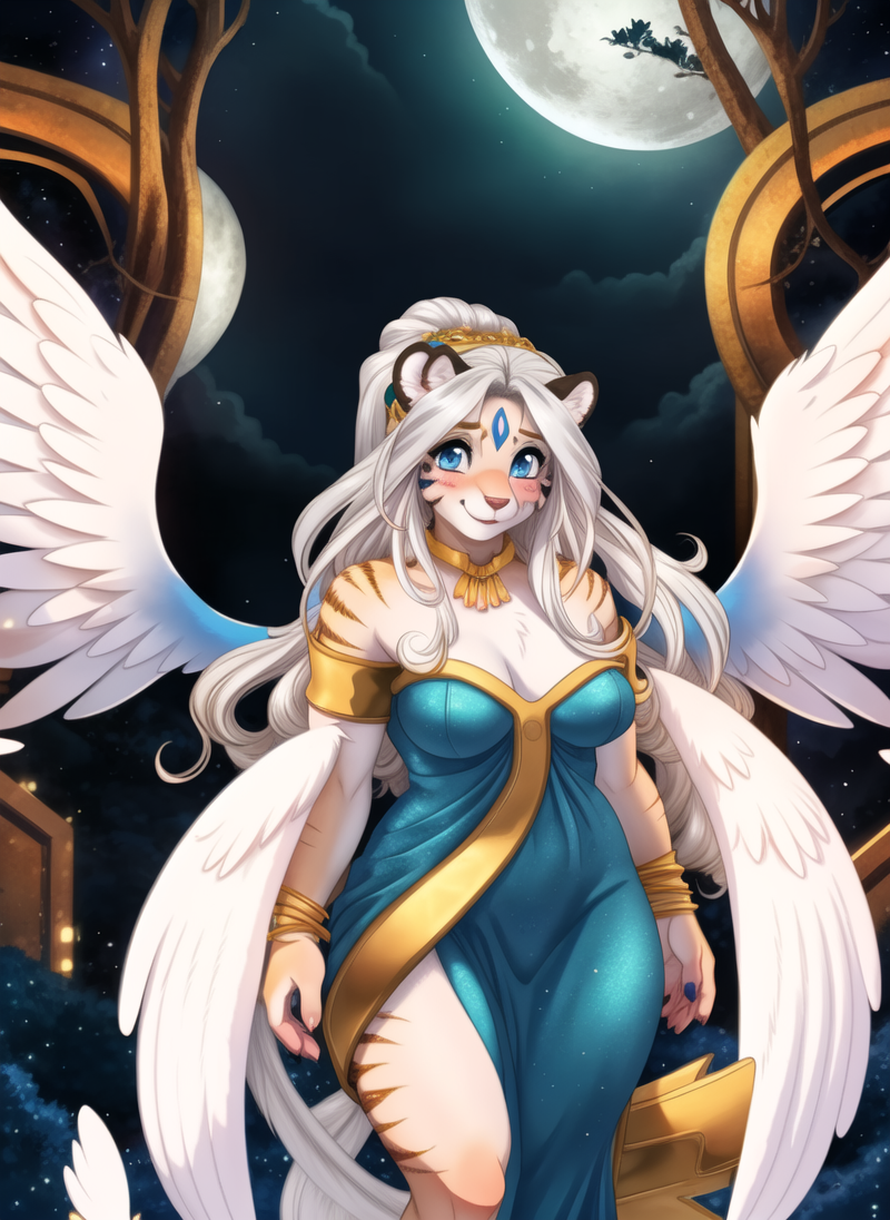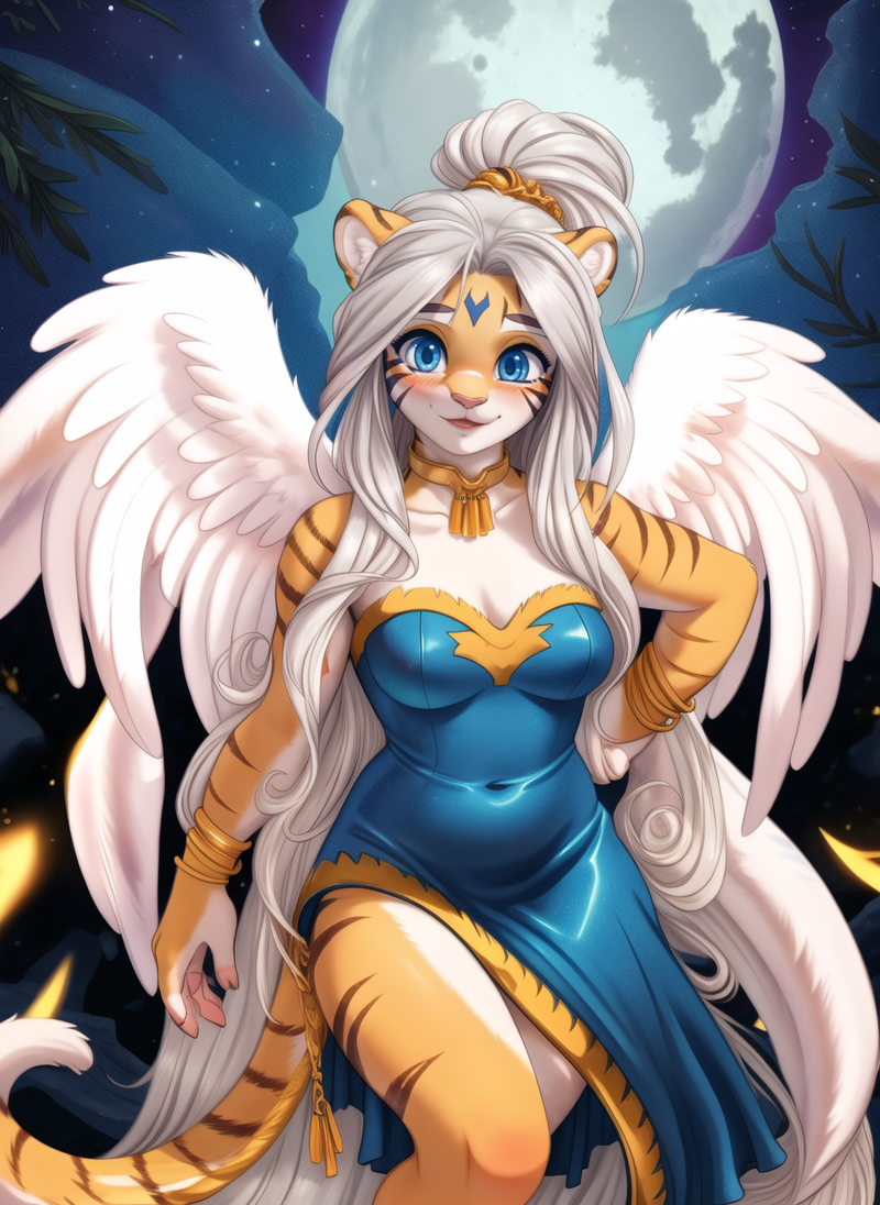 1girl, (warm smile, blush), solo, Ponytail, lips, green eyes, shimmering eyes, bright eyes, thighs, anthro, tiger, white tiger, white fur, (((white hair))), long hair, wavy hair, blue eyes, furry female, adult, medium breasts, collarbone, tiger ears, muscular female, tiger tail, blue and gold cloths, gold tiara, long dress,