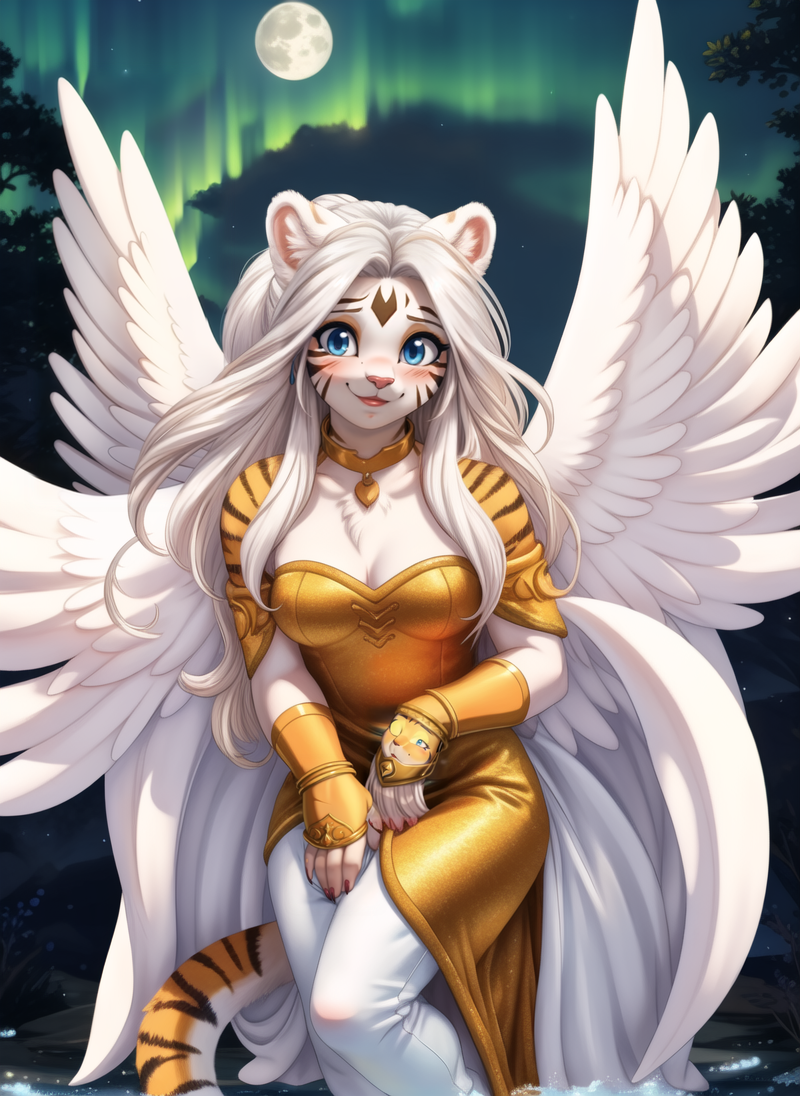 1girl, (warm smile, blush), solo, Ponytail, lips, green eyes, shimmering eyes, bright eyes, thighs, anthro, tiger, white tiger, white fur, (((white hair))), long hair, wavy hair, blue eyes, furry female, adult, medium breasts, collarbone, tiger ears, muscular female, tiger tail, blue and gold cloths, gold tiara, long dress,