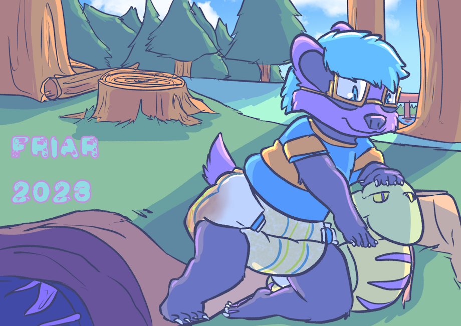 Illustration of Everett the wet and messy diapered badger with his snake plushie outside of a hole in the ground in the forest.